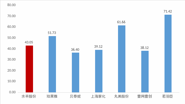 由于公司主要业务包括品牌化妆品及品牌管理服务,因此,选取品牌化妆品领域珀莱雅、贝泰妮、上海家化、丸美股份,以及电商服务领域壹网壹创、若羽臣为可比公司,水羊股份P/E(TTM)为43.05,从同期可比公司P/E(TTM)上看,公司目前估值处于较低水平(注:相关指标计算以2023年7月14日A股收盘价为基准)。