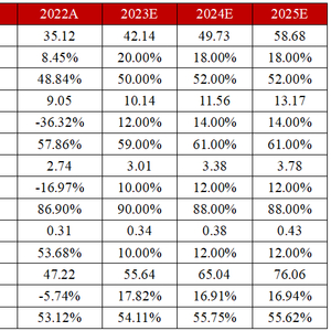 我们预计2023-2025年公司营业收入分别为55.64、65.04、76.06亿元,同比增长17.82%、16.91%、16.94%,归属于母公司股东净利润分别为2.60、3.40、4.00亿元,对应EPS分别为每股0.67、0.87、1.03元。