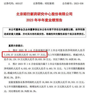 昭衍新药的股价表现或许与公司7月14日发布的半年度业绩预告相关。根据预测,2023年上半年,公司实现归属于上市公司股东的净利润将在7276.57万元到1.1亿元之间,同比降幅为70.4%到80.4%;归属于上市公司股东的扣非净利润将在6032.49万元到9483.70万元之间,同比降幅为72.5%到82.5%。