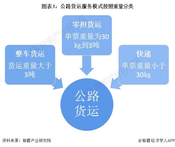 公路货运行业经过40余年的发展已经衍生出了较为成熟的服务模式,通常其服务模式按照重量划分,可划分为整车货运、零担货运以及快递三大类。