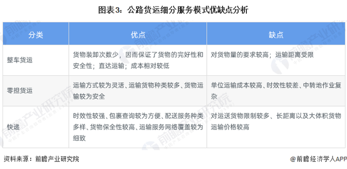 从服务模式的优缺点来看,整车货运具有运输成本较低的特点,作为最传统的公路货运模式,由于单纯依靠货车进行押运,因而其运输距离为受限最为明显,除此之外,零担货运以及快递均有相应的优缺点: