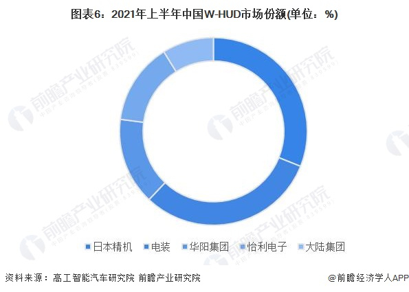高工智能汽车研究院数据显示,2021年上半年我国W-HUD搭载量前五名的供应商分别为日本精机、电装、华阳集团、怡利电子和大陆集团。其中,日本品牌日本精机与电装占据市场份额过半,本土企业华阳集团占据14.4%市场份额,怡利电子获13.5%市场份额,德国企业大陆集团占据8.5%份额。以华阳集团为代表的本土品牌正逐渐打破外企垄断的市场格局。