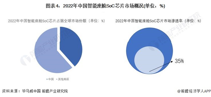 智能座舱SoC芯片方面,近年来,我国智能座舱SoC芯片市场发力迅猛,占据全球38%的市场规模,从SoC芯片的渗透率来看,中国智能座舱SoC芯片的渗透率达35%,完成较大突破。