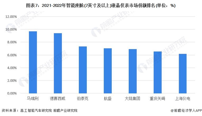 车载液晶仪表方面的市场份额较为分散,高工智能汽车研究院数据表明,德赛西威、伯泰克、华阳等为代表的数家中国本土供应商在7英寸及以上的仪表市场取得了较为明显的发展。但2022年意大利企业马瑞利以9.71%占据中国该市场最大份额。