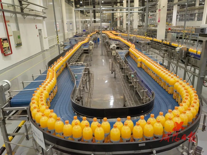 整个生产车间采用智能化生产线,自动化程度高,每小时可生产3.6万瓶果粒橙饮料……