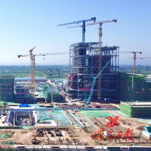 塔吊林立,机声轰鸣,焊花飞舞,工程车辆穿梭在项目现场,工人们正铆足干劲赶工期……