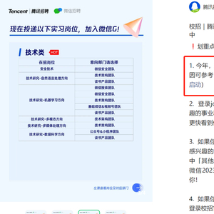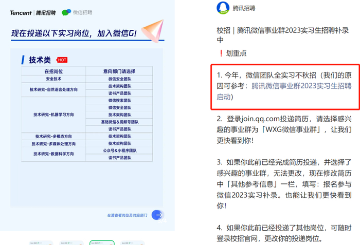 1.今年,微信团队全实习不秋招(我们的原因可参考:腾讯微信事业群2023实习生招聘启动)。