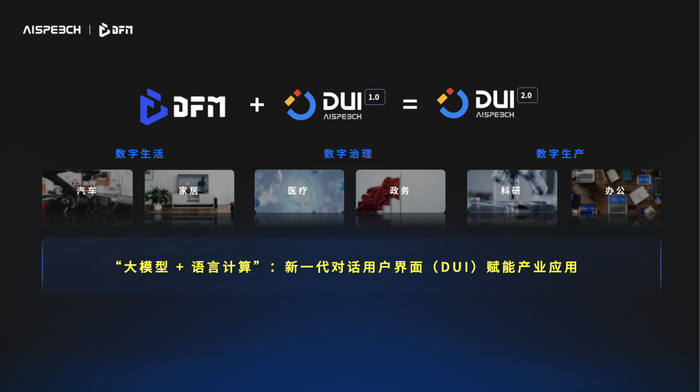 俞凯表示“基础 AI 技术创新,必须最终走入产业,结合场景应用才会变得有价值,大模型将会成为产业数字化的重要赋能者。大模型+语言计算将作为新一代对话用户界面(DUI)赋能产业应用”。为进一步满足市场的个性化需求,思必驰将DUI平台与DFM-2大模型相结合,推出DUI 2.0,完成对话式AI全链路技术的升级,推进深度产业应用。
