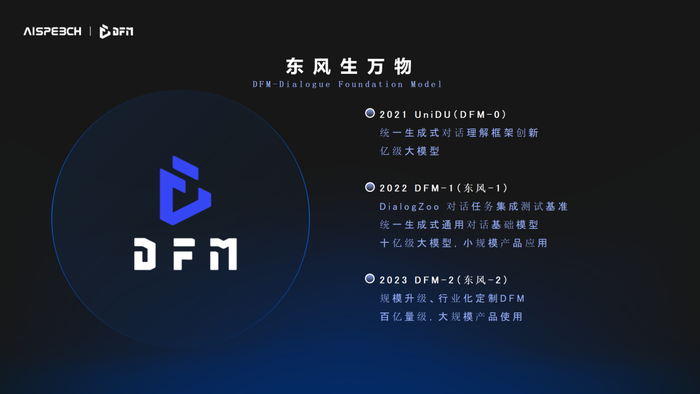 现场,俞凯正式发布了思必驰自研的对话式语言大模型DFM-2(Dialogue Foundation Model),中文直译为“通用对话基础模型”,中文取首字母谐音“东风”,既借中国的战略军事力量代号致敬我国核心战略科技自强自立自主的探索精神,又寓意我国AI行业东风已来的大好前景,也显示将用大模型之东风助力千行百业实现“沟通万物、打理万事“。
