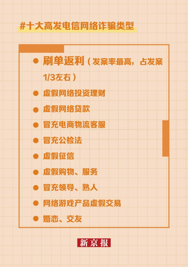 目前,刷单返利、虚假网络投资理财、虚假网络贷款、冒充电商物流客服、冒充公检法、冒充领导熟人、婚恋交友等10种诈骗类型已经成为最常见的高发案件,占发案的80%左右;其中刷单返利类诈骗发案率最高,占发案的1/3左右;虚假网络投资理财类诈骗造成损失的金额最大,占损失金额的1/3左右。