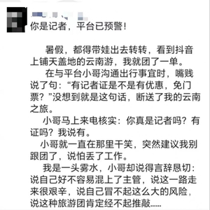 新闻从业者李先生(化姓)表示,自己在某短视频平台上团购了一单云南游,在与平台工作人员沟通出行事宜时,多问了一句:“有记者证是不是有优惠,免门票?”没想到,对方马上来电核实自己的身份,确认后建议李先生不要跟团了,说这种旅游团肯定经不起推敲,他冒不起这么大的风险,怕丢了工作……