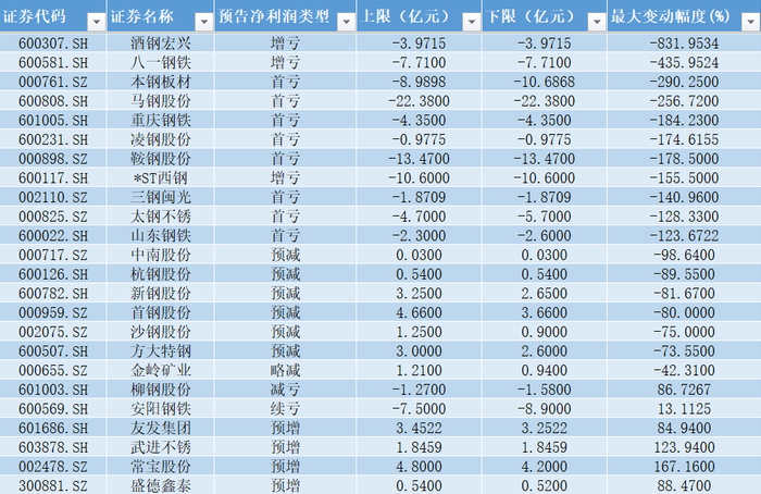 净利润亏损预减幅度较大的是酒钢宏兴(600307.SH),业绩预告显示,公司预计上半年实现归属于上市公司股东的净利润-3.97亿元,去年同期为-4261.48万元,同比下降约831%。