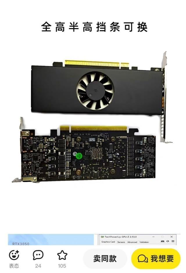 一名闲鱼卖家近日在平台上架了一款RTX 3050半高刀卡,该显卡使用了RTX 3050移动版GPU,但配备了8GB显存。