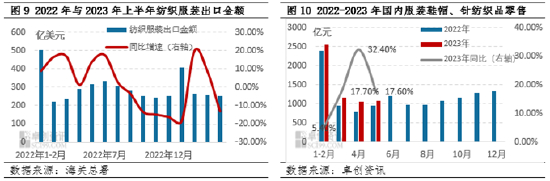 从终端纺织服装需求来看和涤纶长丝有着相反的趋势,2023年1-5月终端纺织服装内需整体恢复较好,但出口受海外持续加息影响整体偏弱。国家统计局数据显示,2023年1-5月国内服装鞋帽、针、纺织品类累计零售额5619亿元,同比增加14.1%;其中服装类零售额4148亿元,同比增加17.4%。根据海关总署数据显示,2023年1-5月份纺织品服装出口金额在1182亿美元,同比下降5.3%。