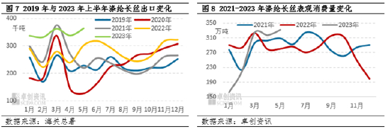 需求方面,上半年涤纶长丝经历了强预期到弱现实再到乐观预期的过程,在此过程中国内下游工厂的备货心态越发谨慎,除了5月集中抄底囤货外,其余周期下大部分时间提前或大幅度备货意愿不高。上半年涤纶长丝需求中性主要是依靠出口的强势支撑、内需偏弱:2023年1-5月涤纶长丝出口量在173.85%万吨,同比增长30.28%;出大幅增长主要有三个原因:首先是印度BIS进行新的认证导致上半年涤纶聚酯抢出口、1-5月涤纶长丝同比增量中有超过40%来自出口至印度的新增;其次是因终端产业转移导致中间聚酯涤纶产品出口增加;最后是海外贸易商反应今年国内聚酯涤纶产品价格优势明显。