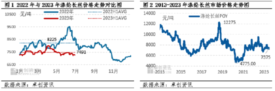 2023年上半年价格来看:涤纶长丝市场价谷值出现在1月初、价格在7250元/吨;而涤纶长丝市场价格峰值出现在4月上旬,价格达到8000元/吨,主要受到高成本的推动——3月中旬后美国银行问题缓解叠加欧佩克减产消息刺激原油价格强势上涨,直接原料PTA在现货流动偏紧下基差大幅走强,期现货价格大幅度上涨,涤纶长丝跟涨成本但与此同时下游负反馈也逐步显现,利润持续亏损。
