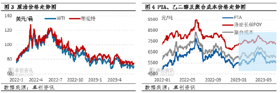 从整体价格走势来看,1月-3月中旬涤纶长丝价格呈现震荡起伏、成本支撑逻辑为主:期间主要受到疫情后终端需求强预期对市场形成利好加之年初长丝供应收紧、价格上行;随后需求验证下并未兑现预期产生利空同时伴随供应宽松化、价格出现回落。3月中下旬到4月上旬价格上涨,宏观利好推动油价,加之PX-PTA供应偏紧加剧成本强势,涤纶长丝在弱需求下跟涨成本。4月中旬到5月中旬价格回落,美国加息叠加银行危机再度发酵,油价一度跌至年内低点。5月下旬至今价格先涨后跌,涤纶长丝库存经过减产以及下游抄底囤货后降至中性水平,行业韧性提升;随后原料PTA基本面转向过剩,涤纶长丝在成本下行影响下震荡回落。