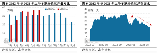 上半年涤纶长丝新装置投产较多,合计有316万吨直纺长丝新产能,新增产能上相比去年同期增长66.32%。尽管上半年涤纶长丝新投产集中,但产量却出现负增长,2023年上半年涤纶长丝产量在189.55万吨(含切片纺),较去年同期减少0.33%。产能增速创今年新高下,产量出现负增长,主要受到了长丝存量装置供应缩减——上半年聚酯工厂前后有过两次大规模集中减产,第一次是1-2月春节假期的影响,第二次是4月受原料大涨及需求偏弱拖累、持续亏损下减产保价。5月之后伴随去库、利润修复涤纶长丝负荷持续攀升,整个5-6月涤纶长丝直纺开工在91%以上。 从涤纶长丝库存来看,1-2月长丝库存出现季节性累库;3月以后伴随减产以及下游抄底补库,涤纶长丝进入去库存趋势,截至6月底涤纶长丝平均库存在17天左右的中性水平线。供需基本面好转也直接影响到涤纶长丝价格主动性更强,进入5月后涤纶长丝价格跟随PTA回落,但价格跌幅明显小于成本端,利润迎来修复。
