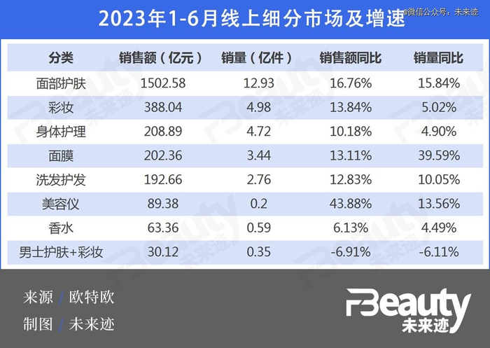 《FBeauty未来迹》从欧特欧咨询获取的数据显示,与化妆品零售市场上升的总体趋势相同,各大细分市场基本呈现上升趋势,具体表现出以下特点: