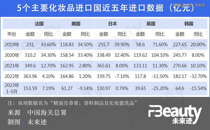 另据中国海关总署官网发布的“我国自部分国家(地区)进口商品类章金额表”系列数据,我国对5个主要化妆品进口国的进口数据,今年1-5月,有英国、韩国、美国三个国家出现负增长,同比增长率分别为-25.20%、-15.54%和-9.14%。日本在去年同比下降7.1%的情况下,今年1-5月录得0.79%的小幅增长。