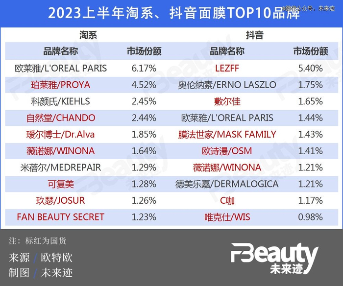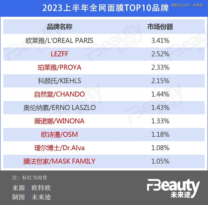 3、面膜市场国货外资7:3表现尚可,新锐品牌LEZFF突围。