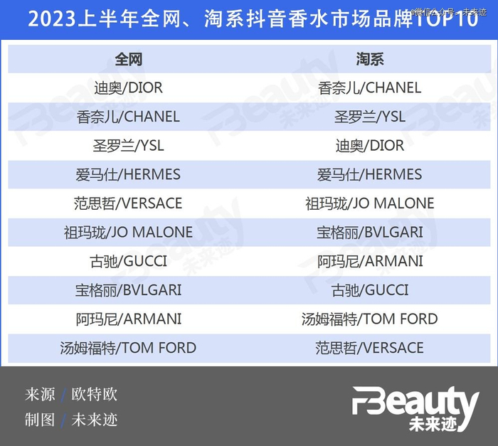 通过对比全网、淘系、抖音2023上半年香水、身体护理市场品牌TOP10榜单,可以发现,淘系平台榜单与全网榜单品牌重合度较高,其中香水榜单最为明显,前十品牌全部重合,仅有排位上的变化。