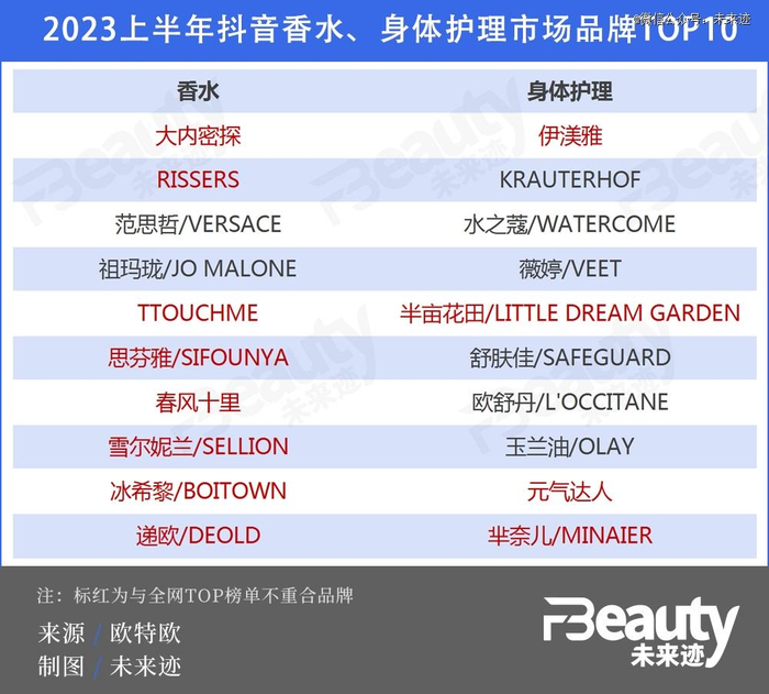 根据欧特欧咨询提供的数据,综合全网、淘系、抖音上半年化妆品销售情况来看,抖音在香水、身体护理细分市场中,能在TOP榜单上看到一些新面孔。