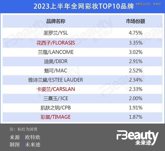 今年上半年全网彩妆TOP10品牌中,国货与进口品牌的比例为3:7,圣罗兰、兰蔻、魅可MAC等5个进口品牌均取得销售额同比上涨,其中,圣罗兰表现最为亮眼,以34.46%的销售额同比增长率,获得4.75%的市场份额,位列*。