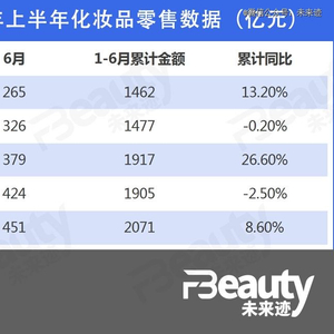 此外,上半年,社会消费品零售总额227588亿元,同比增长8.2%,6月份,社会消费品零售总额39951亿元,同比增长3.1%。对比看,化妆品类在6月与今年上半年,零售额增速均跑过市场大盘。