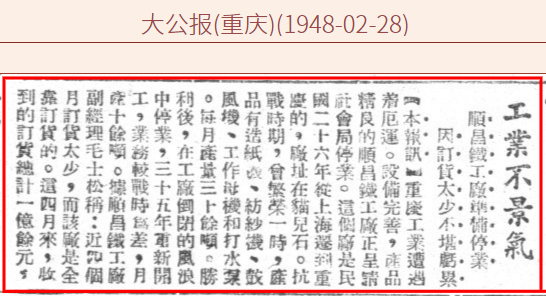 1948年2月《大公报》(重庆)报道顺昌铁工厂概况