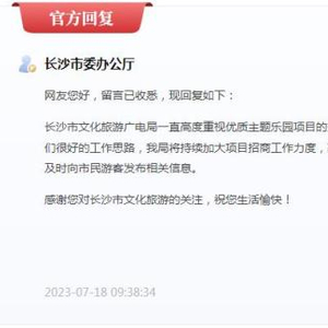 2、“您的问询给了我们很好的工作思路,我局将持续加大项目招商工作力度,高度关注并积极协同相关部门与迪士尼项目对接洽谈,争取未来项目落户长沙意向,并及时向市民游客发布相关信息。”