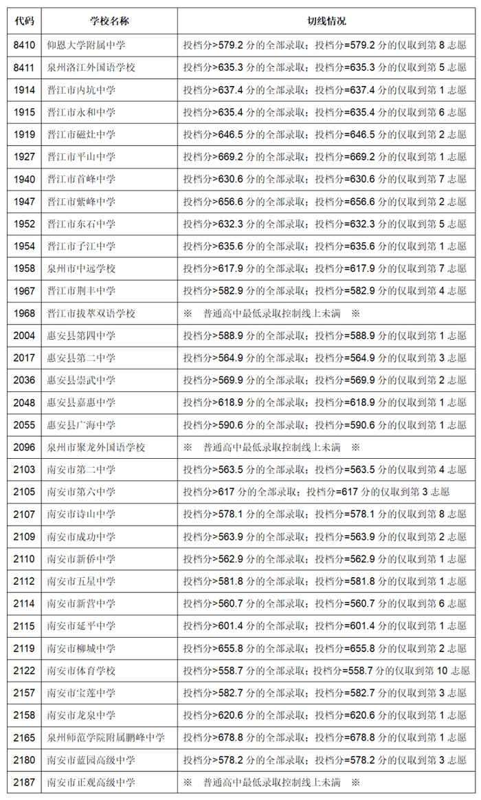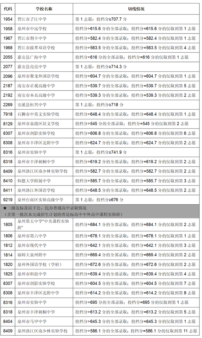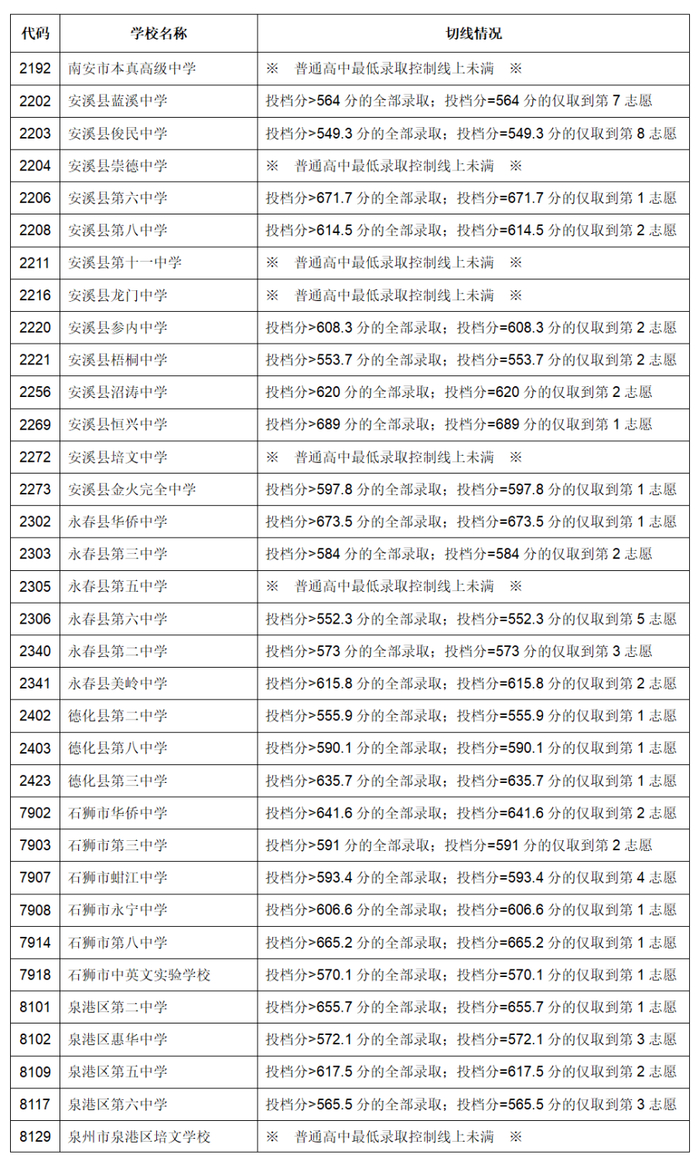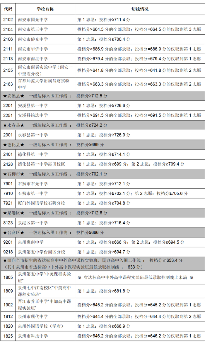泉州市普通高中最低录取控制线为:532分。第一批次省达标高中中外高中课程实验班最低录取控制线为:633分。第一批次面向全市招生的民办高中入围工作线为653.4分。