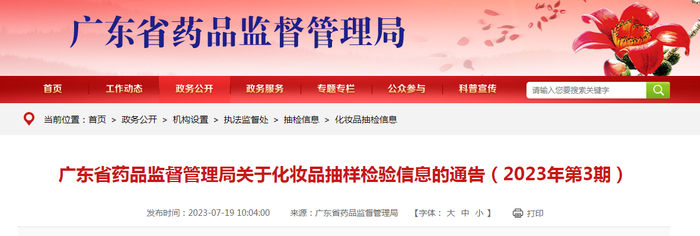 中国质量新闻网讯 7月19日,广东省药品监督管理局网站发布关于化妆品抽样检验信息的通告(2023年第3期)。通告称,为加强化妆品监管,保障公众用妆安全,根据广东省化妆品抽检计划,广东省药品监督管理局组织对全省化妆品生产经营环节进行化妆品抽样检验,现将化妆品抽样检验信息予以公布。