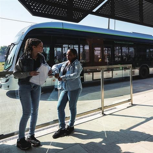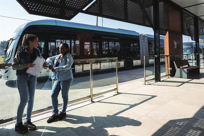 巴西的航天城圣若泽杜斯坎普斯拥有该国首个纯电动城市快速公交系统。2021年11月起,12台22米长的比亚迪纯电动铰链式大巴在圣若泽杜斯坎普斯交付使用,用于当地纯电动快速公交系统“绿线”。图为在圣若泽杜斯坎普斯,市民在快速公交系统“绿线”始发站等车。 新华社记者 王天聪 摄