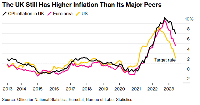 英国目前的情形与美国形成了鲜明对比,在美国,通胀率急剧下降至3%,这使市场认为,美联储有望很快结束加息周期。