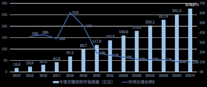 天风证券研报称,代糖行业2030年有望取代传统糖消费近30%市场空间。《2021中国无糖饮料市场趋势洞察报告》则预计,中国无糖饮料的市场规模将在2025年达到227.4亿元。