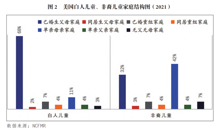 与此同时,非裔家庭的碎片化程度也远超白人家庭。2021年,美国约有68%的白人孩子生活在已婚生父母家庭中,生活在单亲家庭中的白人孩子占比仅为15%。但与白人孩子完全相反的是,美国仅有32%的非裔孩子生活在已婚生父母家庭中,却有近一半(46%)的非裔孩子生活在单亲家庭中。并且,因为非裔的监禁率和非婚生育率都远超白人,这些生活在单亲家庭中的非裔孩子往往生活在父亲缺位的单亲母亲家庭之中。(图2)而在美国,由于单亲母亲家庭往往与贫困相伴,其导致非裔孩子往往比他们的白人同伴更容易生活在贫困之中。