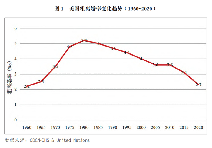 此外,虽然美国现今的粗离婚率在经历了20世纪60年代至80年代的一路攀升后已恢复至1960年左右的低离婚率状态(2020年,2.3‰),(图1)但这是由不婚群体的增加和初婚年龄的推迟导致的。事实上,美国处于离婚状态人口的比例和10年内离婚比例仍然非常高。统计数据显示,2018年,美国有21%的已婚女性现处于离婚/分居状态;在美国1970年后进入婚姻的群体中,大约有1/4的夫妻会在10年内结束婚姻。(NCFMR)