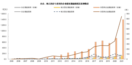 图表15:央企及地方国企股权激励规模及案例数量低于非国有企业
