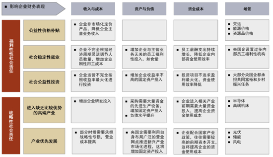 福利性、战略性社会责任与经营目标协调发展:央国企长期承担着超越经营业务的社会责任。福利性社会责任体现在央国企为保障社会民生、促进区域经济发展等发挥的重要作用。战略性社会责任体现在央国企为实现国家长远发展目标,进入高端产业链环节,追求技术的先进性;通过非市场化定价方式配置资源,推行部分产业优先发展战略。央国企在前期通常面临短期经济效益的压力,但长期有助于推动高端产业崛起和国家产业结构调节。随着国企改革的推进,央国企正逐步优化经济布局和结构,寻找主业与社会责任相互协同的机制,协调盈利目标和社会发展目标。