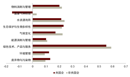 参考图表38央国企在各个环境细分议题的表现,央国企在污染物和环境治理合规等项目表现领先于非央国企,而在物料与能源消耗等直接关联于降本增效的项目上表现仍需提高。某些重排放的传统行业的央国企已经开始带头做出改变。