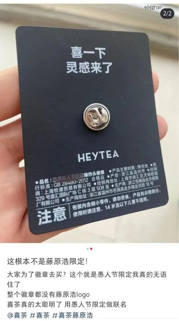 不仅如此,联名也成为很多品牌处理囤货的方式之一,甚至连周边都还残留着之前的痕迹。比如当时喜茶和藤原浩的联名刚推出,就有网友发现,在同步推出的限量徽章上印着的是“愚人节”,被质疑喜茶是把愚人节的囤货重新拿出来做联名周边。