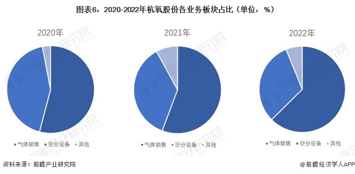 杭氧股份作为中国本土空分设备企业技术引导者,正积极扩大企业的涉足领域。目前,杭氧股份充分发挥在空分设备制造领域的优势,大力发展气体业务,向气体服务转型的势头十分明显。2020年,杭氧股份工业气体占整体营业收入比重为54.09%;2021年,杭氧股份工业气体占整体营业收入比重为55.70%;2022年,杭氧股份工业气体占整体营业收入比重为62.54%。杭氧股份工业气体的业务比重已过半且呈现逐年升高的趋势,其工业气体供应已占据市场一大份额,成功由空分设备制造商向工业气体供应商转型升级。