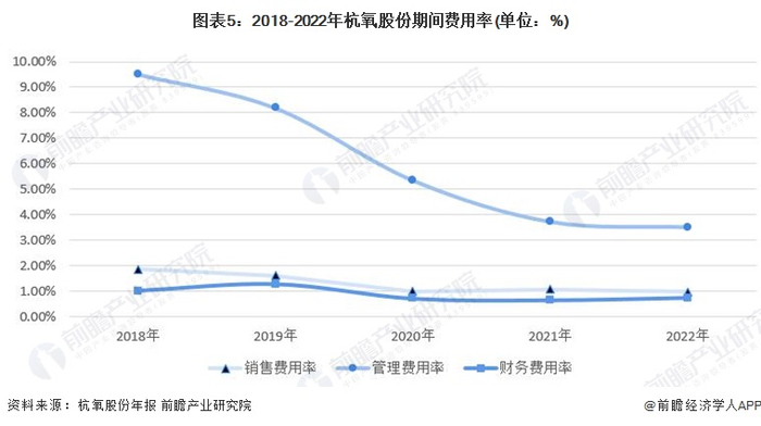杭氧股份年报数据显示,2022年,杭氧股份的期间费用率得到有效控制。管理费用在期间费用中占比最大,但2018-2022年以来呈现明显的下降趋势,2018年,杭氧股份管理费用率达9.51%;2022年,杭氧股份管理费用率减至3.51%,管理效率明显优化;此外,杭氧股份财务费用、销售费用长期维持在较低区间波动,近年来均未突破2%,其期间费用管控良好。