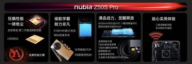 续航方面,努比亚Z50S Pro配备5100mAh超大电池和80W快充组合,日常综合续航可高达约37小时,即使在仅有5%电量的情况下,依旧可完成6个小时待机,让用户无惧电量焦虑。