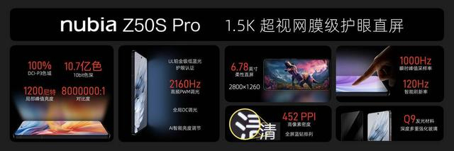 屏幕方面,努比亚Z50S Pro搭载6.78英寸AMOLED护眼直屏,采用顶级蓝钻排列,可实现2800×1260超高分辨率及452PPI超视网膜级高像素密度;具备影院级绚丽臻彩显示,100%覆盖DCI-P3色域,10bit色深,10.7亿色彩范围,8000000:1对比度;支持120Hz刷新率及1000Hz瞬时触控采样率。