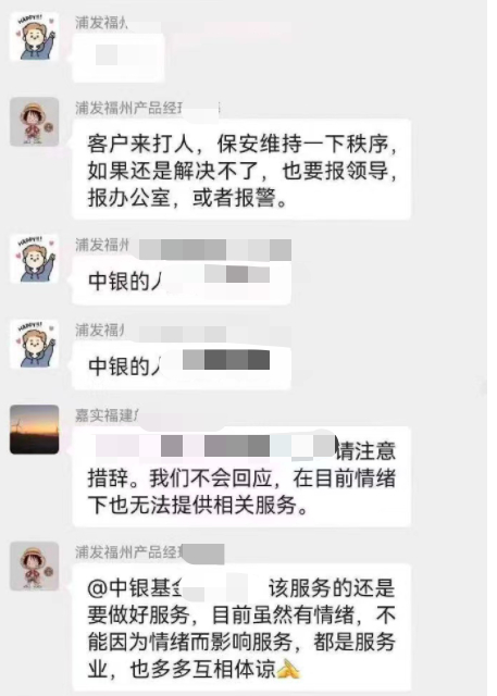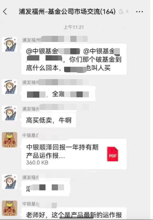 网传图片显示,在“浦发福州-基金公司市场交流”的群聊中,一名浦发银行福州分行的客户经理指责中银基金一款产品一直亏损,没有回本,称其是“高买低卖”,情绪较为激动。随后中银基金一名工作人员发出该款产品的运作报告,但仍然遭到“怒怼”,随后另一名工作人员表示不会回应。