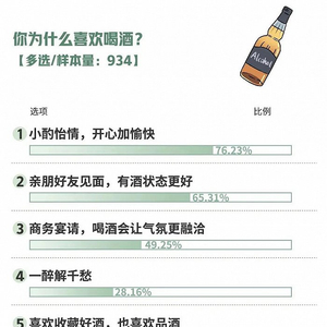 对应的,今年6月18日父亲节,《中国新闻周刊》针对中国父亲饮酒问题展开问卷调查,在近千份饮酒男士填写的问卷中,有超过76%的人将饮酒原因选成小酌怡情,不到28%的人喜欢喝酒的原因是它能一醉解千愁。