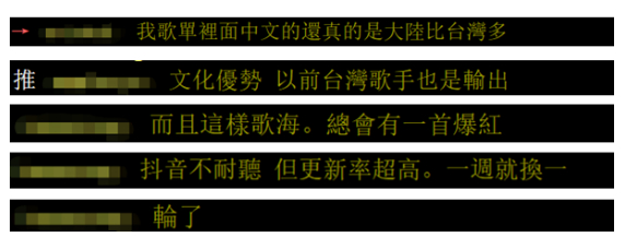 一些网民对此表示,认同近年大陆音乐越来越强,有人认为是市场优势,大陆流行歌通过抖音传播,产量非常大,用数量打造出爆红歌曲。网民称,“我歌单里面中文的还真的是大陆比台湾多。”“文化优势,以前台湾歌手也是输出。”“歌海总会有一首爆红”、“抖音不耐听,但更新率超高,一周就换一轮了。” ↓