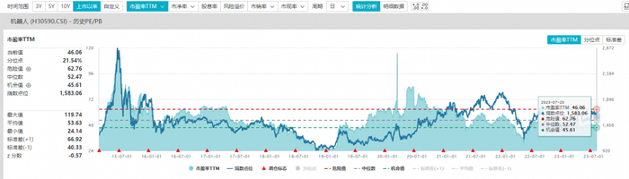从估值来看,当前机器人板块估值仍处于历史较低水平。中证机器人指数 (H30590)当前市盈率为46.06倍,处于21.54%分位点。